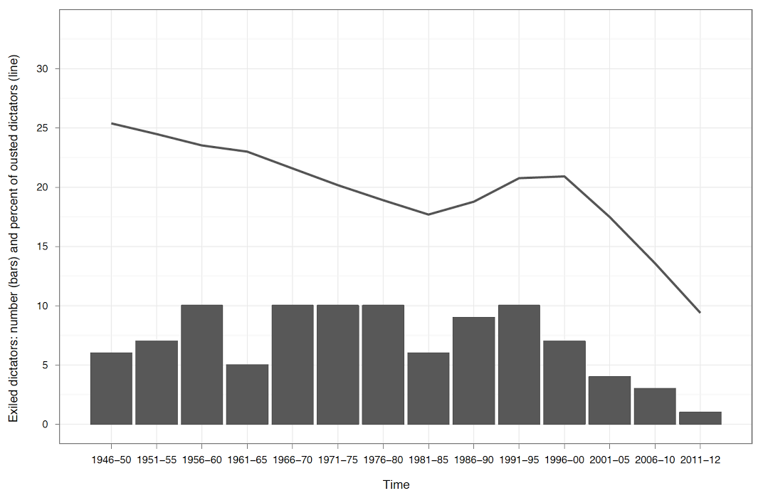We know where these exiled rulers went – but are leaders now having a harder time finding a safe haven for retirement? To begin, the end of the Cold War removed incentives for the superpowers to host ousted rulers from around the globe. Even more important, scholars like Kathryn Sikkink have documented a recent “justice cascade” that seeks to hold leaders accountable wherever they are. Do new tribunals like the International Criminal Court (ICC) and the arrests of high-profile rulers (think of Augusto Pinochet, Charles Taylor, Hissene Habre, and many more) dissuade other leaders from retiring abroad? In other words, is exile no longer the attractive option it once was?