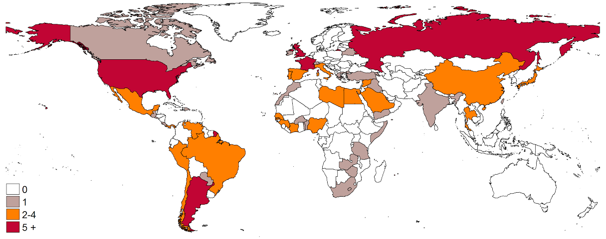 So where do exiled dictators go? Our forthcoming article in the Journal of Politics provides an answer. We collected new data on the destinations of all dictators going into exile since 1946. Our data show that 52 different countries have hosted at least one dictator. The leading exile destinations in our sample were the United States, the United Kingdom, Russia, Argentina, and France—see map below.