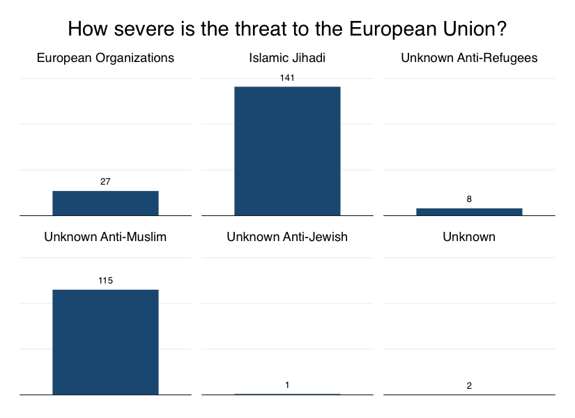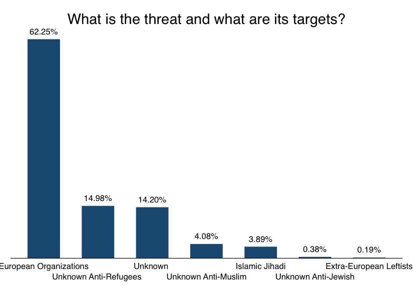 The above bar chart shows that the majority (62%) of terror attacks in European member states between 2014 and 2015 were perpetrated by European homegrown organizations (e.g., Continuity Irish Republican Army), while only 3.89% were perpetrated by Islamist organizations such as Al-Qaeda or ISIS. Almost 15% of terrorist attacks with unknown perpetrators targeted immigrants, including refugees’ centers and asylum lodgings for unaccompanied children.