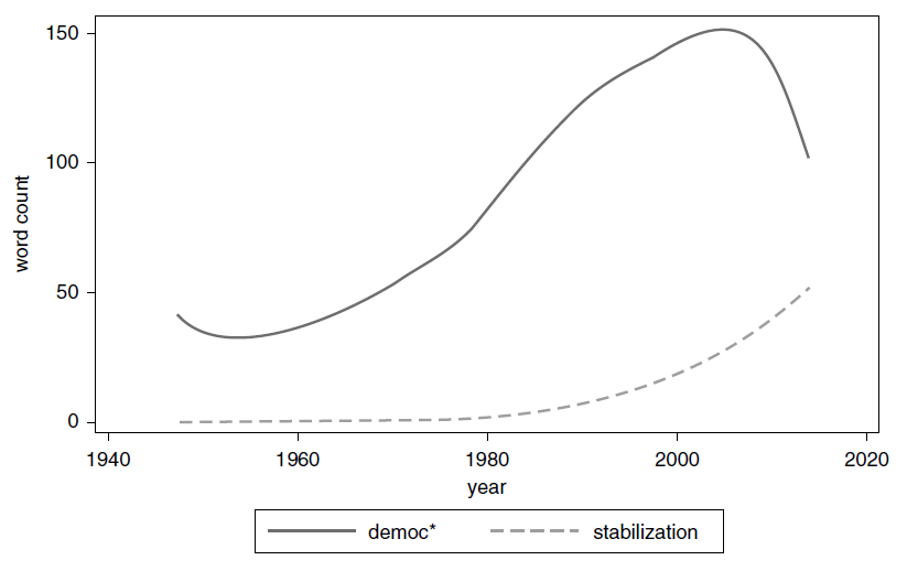 In the figure below, we see a dramatic increase in the word “stabilization,” while words associated with the norm of democracy promotion (democratize, democratization, etc.), decrease after 9/11.