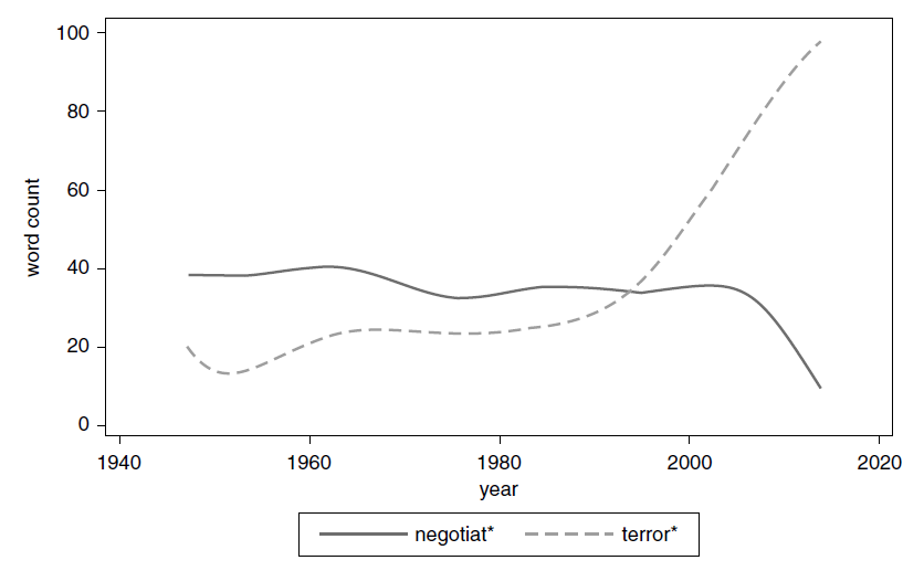 The next figure depicts another set of normative trends important for civil war termination: instances of great power use of words associated with the norm of negotiation (negotiations, negotiating, negotiator) decrease in line with an increase in the use of words associated with terrorism (terror, terrorist). These trends reflect a decrease in the norm of negotiated settlements in civil wars: external powers ought not negotiate with terrorists.
