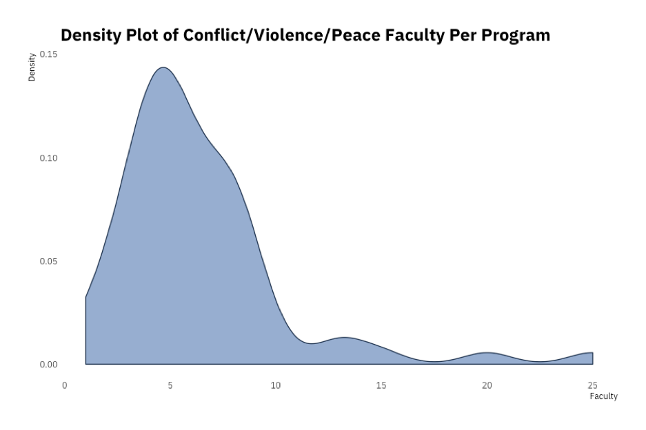 These data could also potentially be combined to create different rankings of conflict/peace programs. To illustrate this, we create an index of program productivity and scholarly breadth. We include in this index measures of the number of conflict/peace faculty (scaled between 0 and 1), the number of different datasets being developed by faculty (scaled between 0 and 1), the number of different topics studied within the program (scaled between 0 and 1), and whether the program has a conflict/peace workshop or speaker series. We add these measures to create a continuous variable that ranges from 0-4, which we use to rank programs.